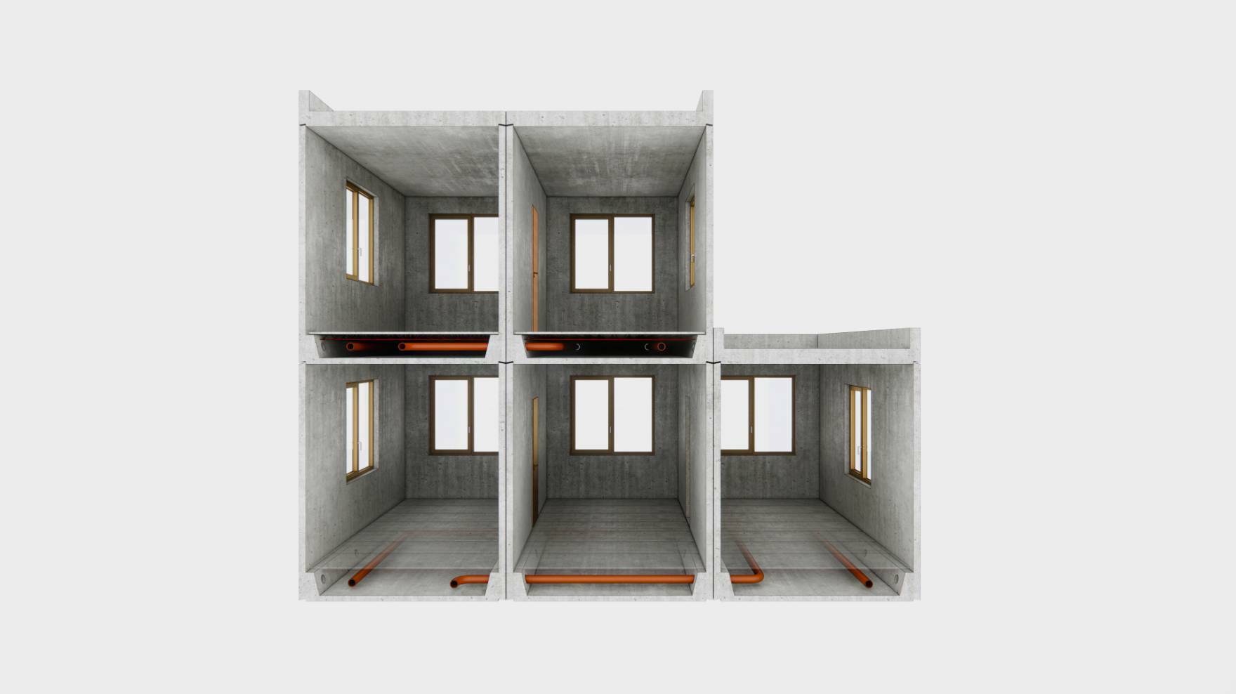 Die Abbildung zeigt einen schematischen Schnitt durch unsere Module, die bereits sämtliche Elemente der Haustechnik enthalten und somit in kürzester Zeit zu einem schlüsselfertigen Objekt zusammengebaut werden.